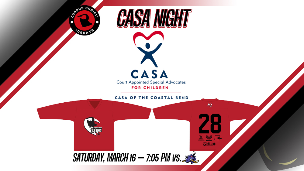 CORPUS CHRISTI, Texas – The Corpus Christi IceRays will host CASA Night presented by Whataburger, KIII-TV and AEP on Saturday, March 16 against the Lone Star Brahmas. The event will feature a special warm-up jersey auction, silent auction, 50/50 raffle and pre-game skate with a portion of proceeds benefiting CASA of the Coastal Bend. Puck drop against the Lone Star Brahmas is set for 7:05 PM at the American Bank Center.
