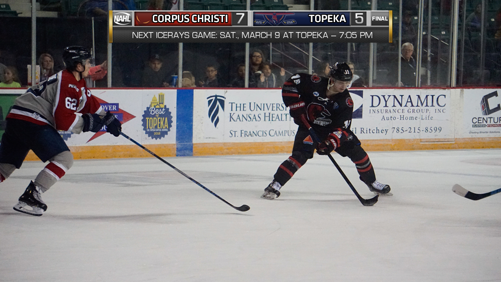 TOPEKA, Kan. – The Corpus Christi IceRays picked up a 7-5 win against the Topeka Pilots Friday night inside Landon Arena at Kansas Expocentre. Nicholas Seitz (2+1) broke the game’s third tie with the game-winning goal midway through the third period.