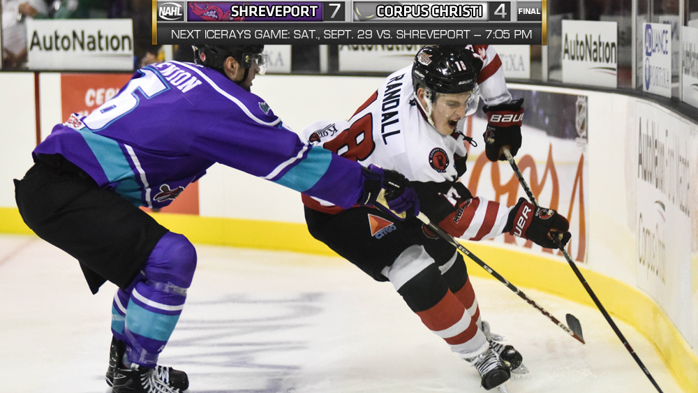 CORPUS CHRISTI, Texas – The Shreveport Mudbugs defeated the Corpus Christi IceRays, 7-4, in the IceRays’ Home Opener Friday night at American Bank Center. Josh Barraclough (2-1–3) and Dakota Concannon (1-2–3) each recorded three points for the Mudbugs.