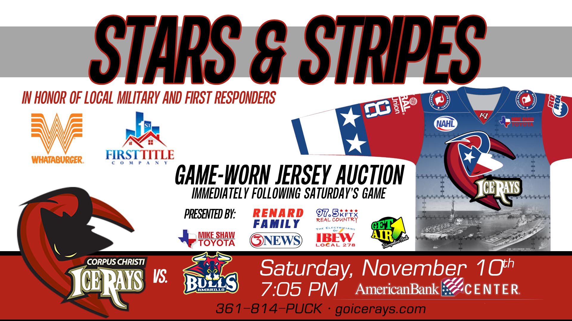 CORPUS CHRISTI, Texas – The Corpus Christi IceRays will host their 11th annual Stars & Stripes Night, presented by First Title Company, Whataburger, KIII-TV3, Mike Shaw Toyota, IBEW Local 278, the Renard Family, and Get Air. The game honors area members of the military and first responders, and will be held on Saturday, Nov. 10. Faceoff is at 7:05 PM as the IceRays host the Amarillo Bulls at American Bank Center.