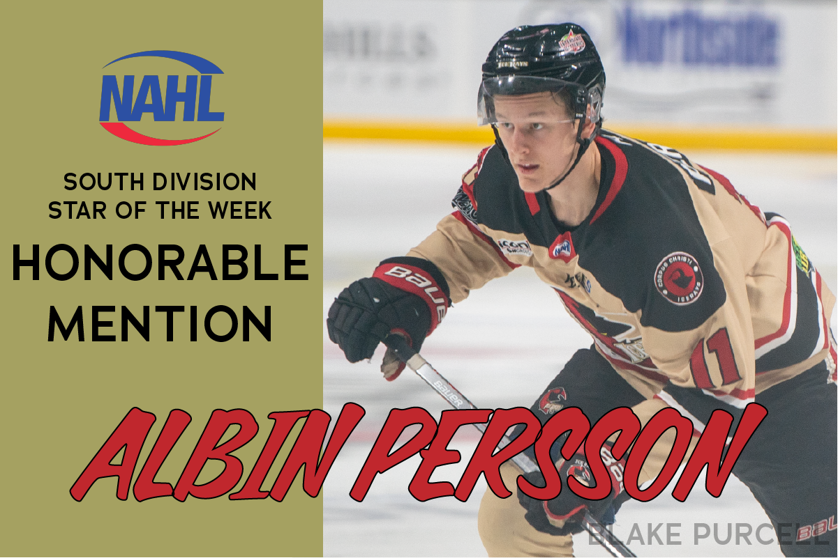 The NAHL is starting to take notice of Persson’s efforts as he was named an honorable mention for this week’s NAHL South Division Star of the Week.