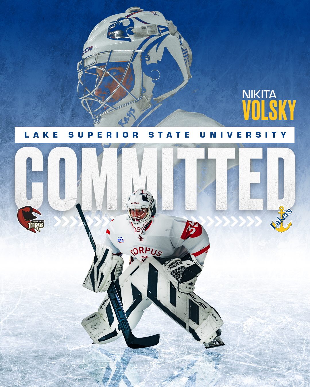 CORPUS CHRISTI, TX – The Corpus Christi IceRays are pleased to announce IceRays Goalie Nikita Volsky’s commitment to Lake Superior State to play NCAA Division 1 Hockey. Volsky has burst onto the scene in his first season in the NAHL with the IceRays starting in 17 games this season posting a record of 14 wins and three losses. His numbers don’t stop there, his 1.91 goals against average and 0.937 save percentage sit him comfortably inside the top 10 in the NAHL while being the only goalie that has faced more than 500 shots this season.